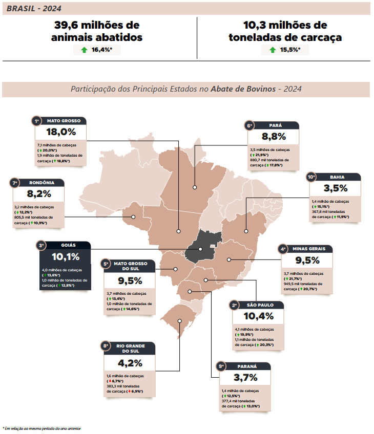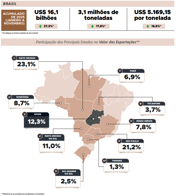 *Exportações: dados de janeiro a novembro de 2025 (Agrostat/MAPA); Abates: dados do 1º ao 3º trimestre de 2025 (IBGE)
