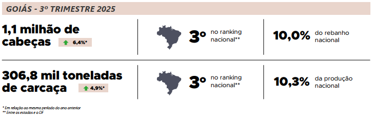 Para Goiás, quanto aos abates, no primeiro semestre de 2025, foram 2,0 milhões de animais abatidos, acréscimo de 1,3% frente ao mesmo intervalo de 2024, totalizando 527,6 mil toneladas de carcaça. Diante desse contexto, a Gerência de Inteligência de Mercado Agropecuário/SEAPA aponta que esse desempenho sinaliza uma tendência de recorde para 2025, uma vez que os números de abates registrados para o terceiro trimestre (1,1 milhão de cabeças e 306,8 mil toneladas de carcaça) são os maiores da série histórica para esse período.