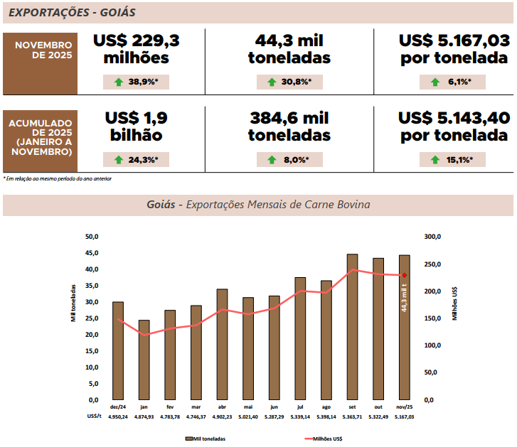 No panorama internacional, o cenário é favorável para o setor. Ao considerar janeiro a novembro de 2025, Goiás alcançou recorde em valor e volume exportado de carne bovina, bem como no número de destinos, posicionando o estado como terceiro maior exportador brasileiro. Nesse período, foram 384,6 mil toneladas embarcadas para 96 países, refletindo em uma balança comercial positiva em US$1,9 bilhão – um recorde para o estado.
