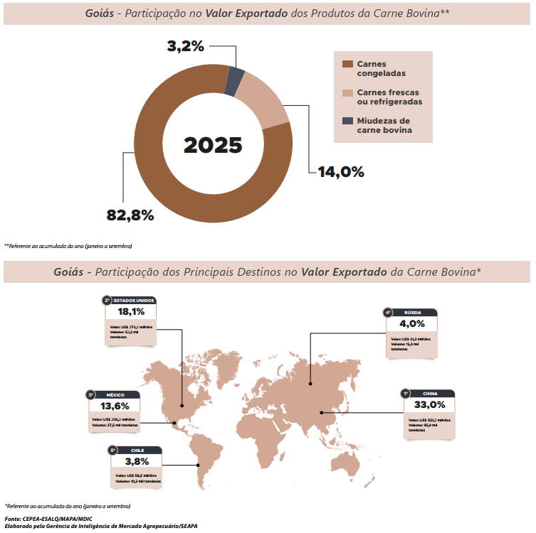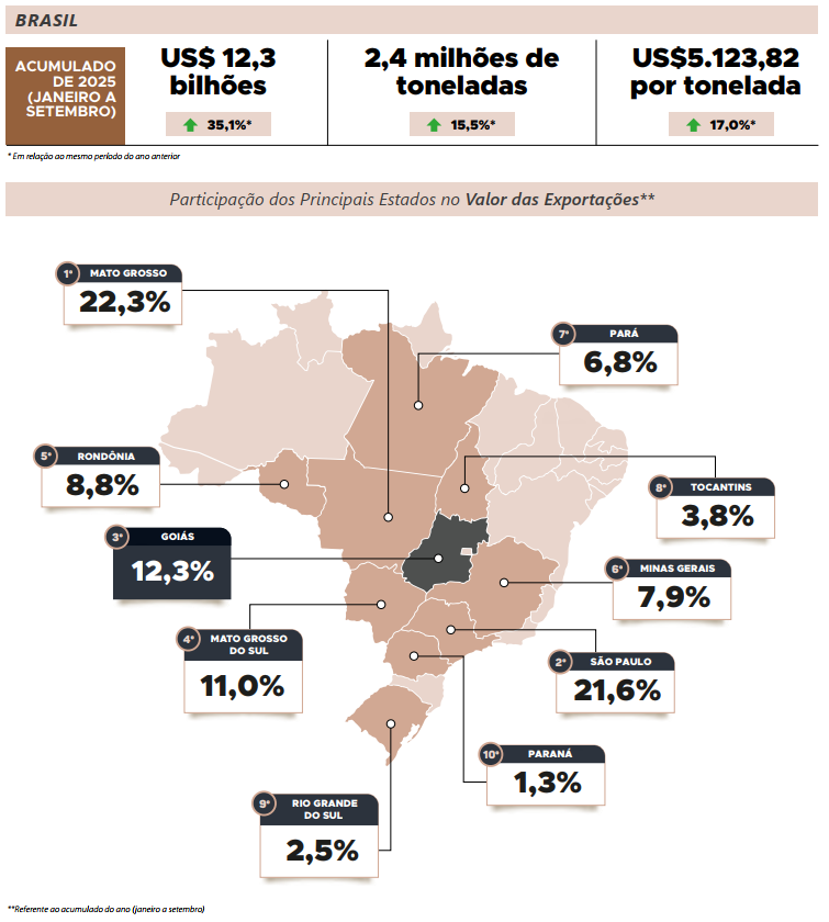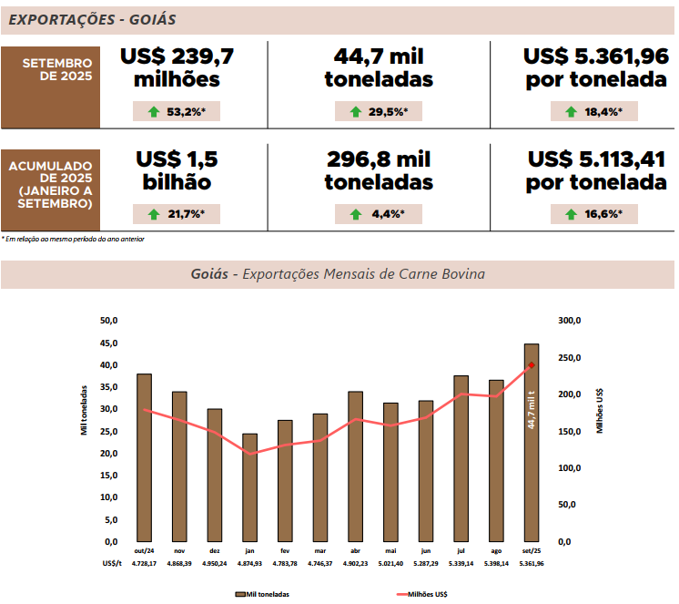Em setembro de 2025, as exportações brasileiras de carne bovina atingiram 347,6 mil toneladas, totalizando US$ 1,8 bilhão e alcançando 129 destinos, o que representa patamar recorde na série histórica do Agrostat/ MAPA, iniciada em 1997. O resultado corresponde a um aumento de 17,7% em volume e de 18,5% em valor exportado em relação a agosto. Nesse período, o preço médio da carne bovina também apresentou leve valorização, passando de US$ 5.407,30 para US$ 5.441,22 por tonelada, acréscimo de 0,6%, movimento influenciado, entre outros fatores, pelo fortalecimento do real frente ao dólar nas últimas semanas. Na mesma base de comparação, o estado de Goiás destinou ao exterior 44,7 mil toneladas de carne bovina, superando as 36,5 mil toneladas embarcadas em agosto e alcançando, assim, um marco histórico para o mês de setembro. Dessa forma, a expectativa é de manutenção do ritmo aquecido das exportações de carne bovina à medida que se aproximam as festividades de fim de ano.