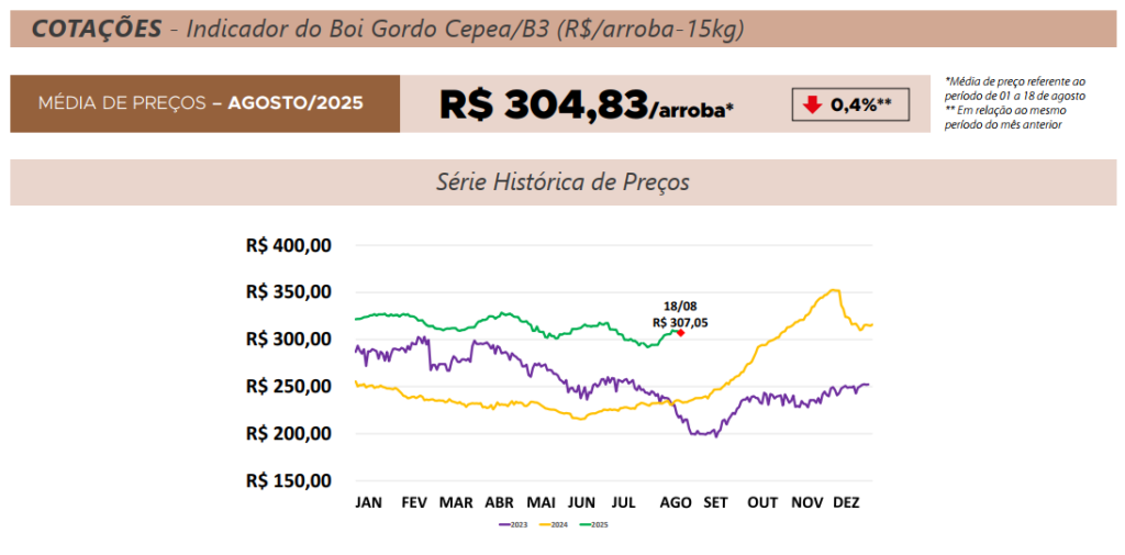 Após o pico alcançado em novembro de 2024, de R$338,76/arroba, as cotações do boi gordo se mantiveram em patamares elevados, ao comparar com os dois últimos anos, oscilando entre queda e recuperação nos preços no decorrer do primeiro semestre de 2025 (ver gráfico da série histórica de preços). Em agosto, a média mensal foi de R$307,25/arroba, acréscimo de 2,4% em relação ao mês anterior. O setor segue resiliente, com sustentação nos preços, m virtude da união entre exportações aquecidas, escalas de abate curtas e oferta restrita de animais prontos para o abate.