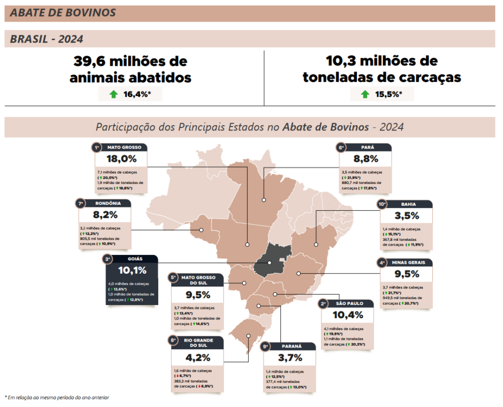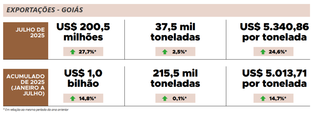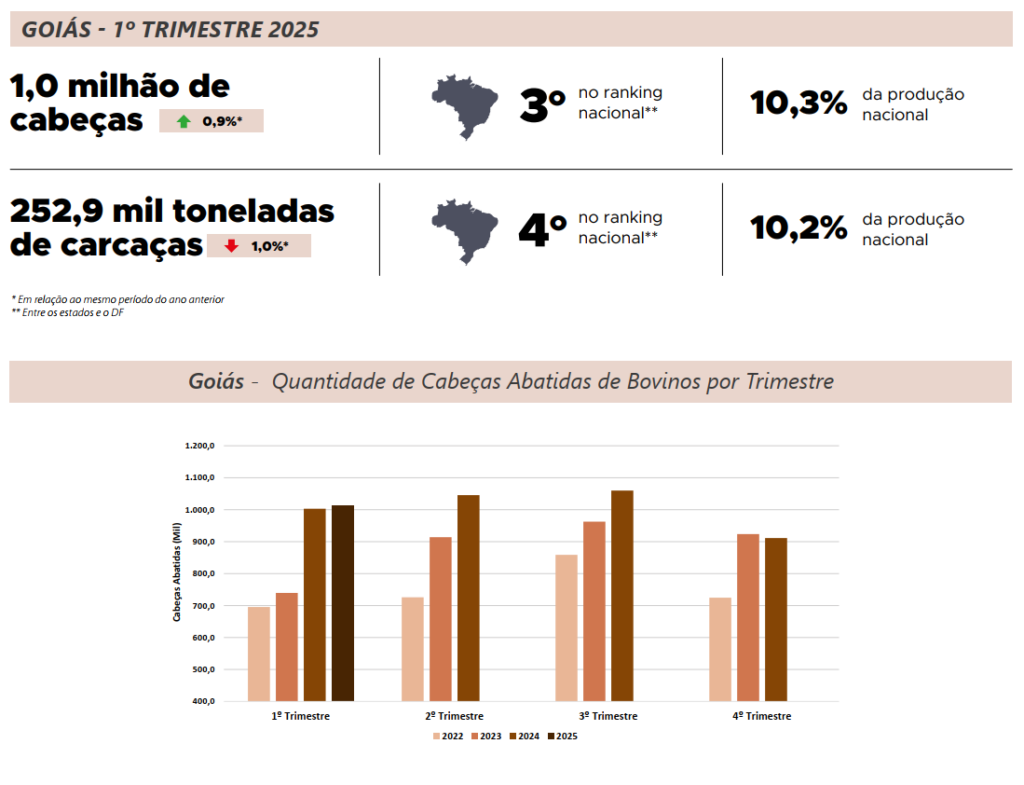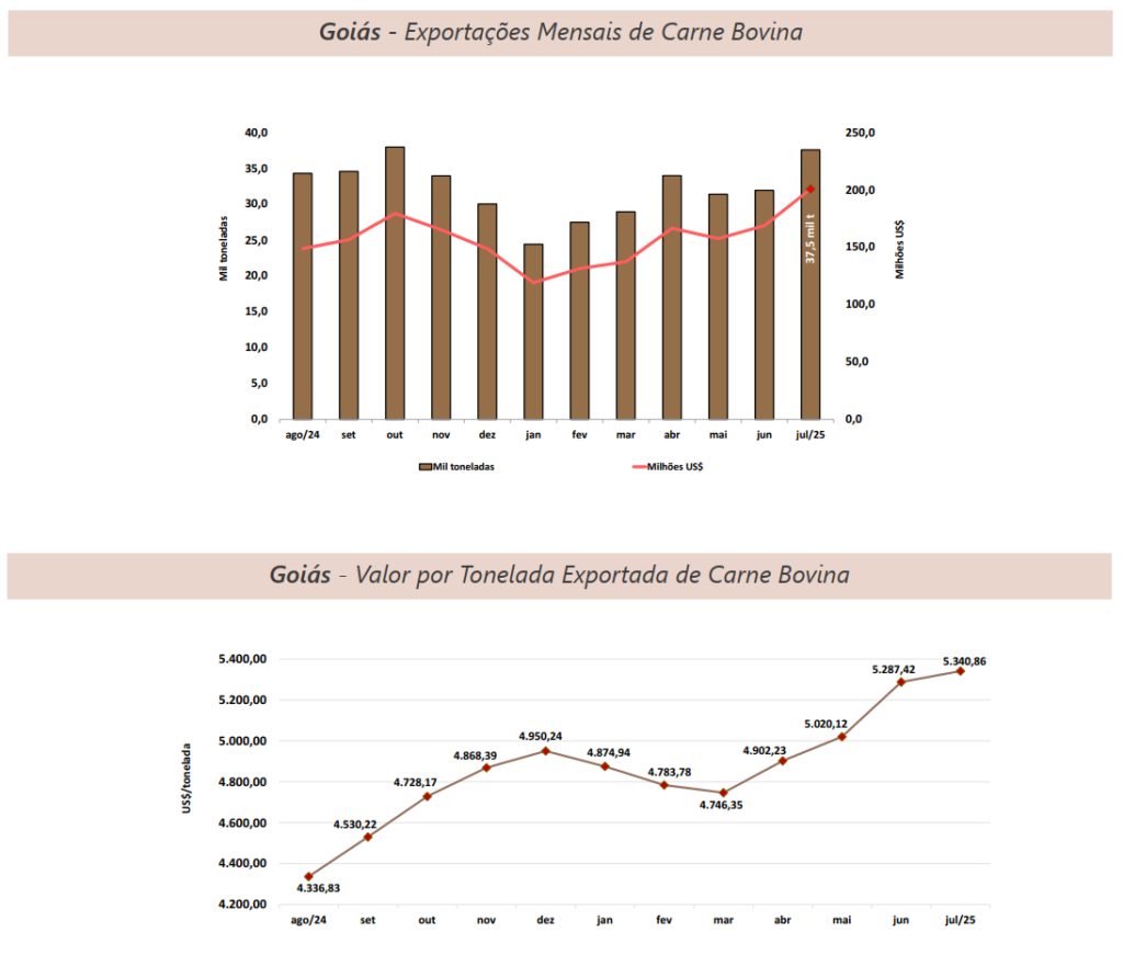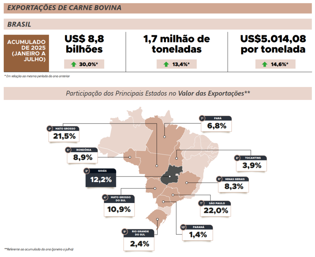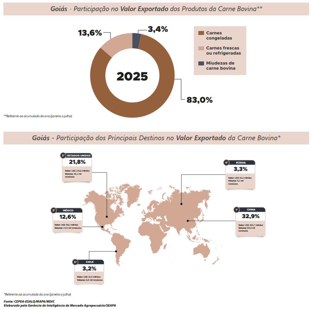 No panorama internacional, mesmo diante de um cenário de incertezas geopolíticas, em julho, as exportações de carne bovina alcançaram um recorde para o mês, tanto para Brasil quanto para Goiás, consolidando o estado como terceiro maior exportador de carne bovina. No contexto estadual, em julho, verificou-se uma diminuição de 33,9% no volume de carne bovina adquirida pela China, em relação ao mesmo período do ano anterior, correspondente a 5,4 mil toneladas. Entretanto, apesar de ser o principal destino da proteína goiana, esse recuo não gerou prejuízos relevantes para o setor, na qual foi compensado pelo crescimento das aquisições feitas em julho pelos parceiros comerciais do estado: México, Estados Unidos, Rússia e Itália.