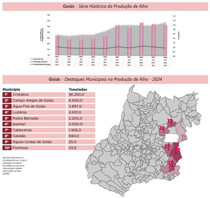 O estado de Goiás é representado pelo protagonismo de Cristalina – segundo maior produtor de alho do país, além de possuir a maior área colhida. Em 2024, de acordo com o IBGE, o município foi responsável por 66,2% da produção estadual. Já no rendimento médio das lavouras, Padre Bernardo e Ipameri lideram o ranking nacional, com respectivamente, 20,0 e 18,1 toneladas produzidas por hectare.