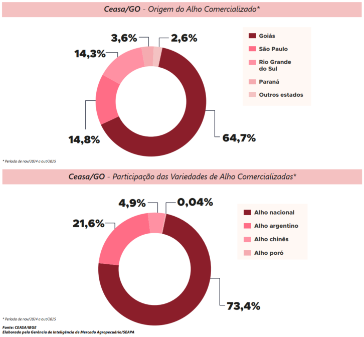 Marcando um importante passo para o fortalecimento da cadeia produtiva, o alho passou a integrar o Programa Nacional de Zoneamento Agrícola de Risco Climático (Zarc), com a publicação da Portaria SPA/MAPA N°454 no dia 25/11/2025. O Zarc define as áreas e períodos mais adequados para o plantio, considerando a probabilidade de perdas devido a condições climáticas adversas. Para Goiás, essa inclusão irá favorecer os produtores, que terão acesso a parâmetros técnicos específicos para o estado, favorecendo assim, o planejamento da safra. Quanto ao plantio, atualmente, em Minas Gerais (maior produtor) e Goiás a semeadura concentra-se nos meses de março a maio, enquanto a colheita pode ser realizada de junho a setembro, segundo o Hortifruti/Cepea.