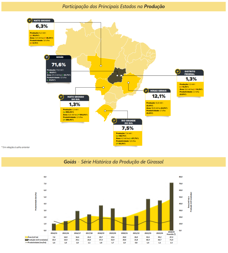 No início da série histórica do girassol, Goiás já se destacava com a maior área cultivada e produção do país, de acordo com os registros da Conab, iniciados em 1997. Na safra 2020/21, o estado retomou a posição de liderança em área plantada e na produção brasileira da oleaginosa. Atualmente, Goiás se consolida como maior estado produtor e, para a safra 2024/25, deve responder por 71,6% da produção nacional, avanço de 13,8 pontos percentuais frente à participação registrada na temporada anterior.