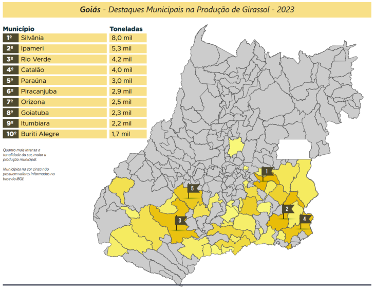 Destacam-se como maiores produtores de girassol os municípios localizados na região do sudeste goiano (Silvânia, Ipameri e Catalão), além de Rio Verde, no sudoeste do estado, de acordo com o IBGE. Dentre eles, Silvânia foi o que obteve maior avanço em área colhida e quantidade produzida, em relação à safra de 2022, atingindo 8,0 mil toneladas cultivadas em 5,0 mil hectares.