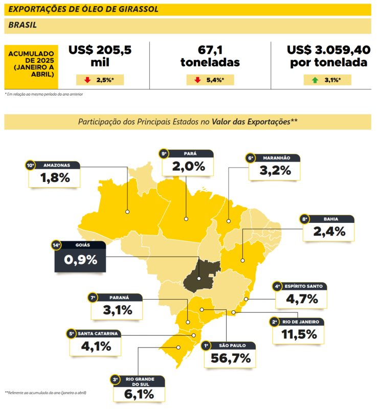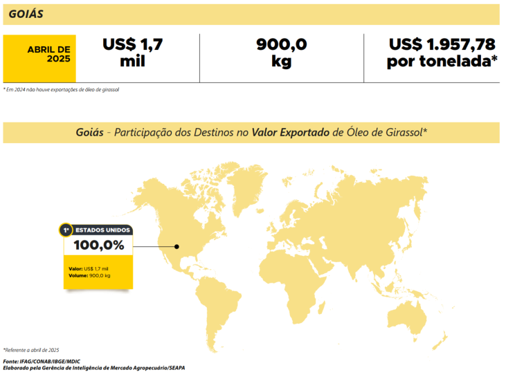 No contexto internacional, para o acumulado de 2025 (janeiro a abril), o Brasil enviou 67,1 toneladas de óleo de girassol para 48 destinos. Para Goiás, as exportações se concentraram no mês de abril, direcionadas para os Estados Unidos. Entretanto, para suprir a demanda interna é necessário a importação deste produto. Nesse período, foram 13,8 mil toneladas importadas pelo Brasil, com origem principalmente na Argentina.