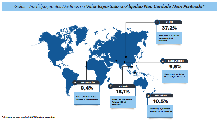 Em relação às exportações em 2024, o algodão brasileiro e seus produtos alcançaram 163 destinos, representando um crescimento de 34,7% nos últimos dez anos. Além disso, houve recorde em volume e valor enviado para o exterior, consolidando o Brasil como o maior exportador mundial de algodão. Já para Goiás, os produtos do algodão foram enviados para 35 destinos, com o retorno nas aquisições pela Índia e aumento de 10,0% no volume exportado para a China, 18,8% para o Vietnã, 12,9% para a Indonésia e 66,5% para a Malásia, em relação ao ano de 2023.