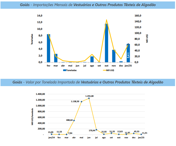 Já no primeiro mês de 2025, foi registrado recorde nas exportações brasileiras para esse período, com crescimento de 65,1% no volume exportado, em relação ao mesmo período do ano anterior. Apesar da diminuição nas aquisições chinesas (-52,6%), o Paquistão aumentou suas compras adquirindo um volume quase 20 vezes maior (99,4 mil toneladas), a Turquia triplicou suas aquisições (39,5 mil toneladas) e Vietnã e Bangladesh mais que dobraram suas importações (73,5 mil toneladas e 65,9 mil toneladas respectivamente), frente a janeiro de 2024.