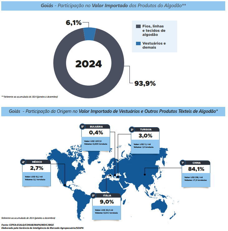 O Brasil é o terceiro maior produtor mundial de algodão – atrás de China e Índia – e responde por 13% da produção global. De acordo com o USDA, na safra 2023/24, houve redução na produção global de algodão pela Índia, China e Estados Unidos, em contrapartida, a produção brasileira aumentou 2,8 milhões (de fardos de 480 lb). Na produção nacional, Goiás ocupa a sétima colocação, com expectativa de colheita de 138,2 mil toneladas na safra 2024/25. Destaca-se como maiores produtores de algodão no estado, os municípios de Chapadão do Céu, localizado no sudoeste goiano, Luziânia e Cristalina, no entorno do Distrito Federal, seguido de Britânia e Jussara, no oeste goiano.