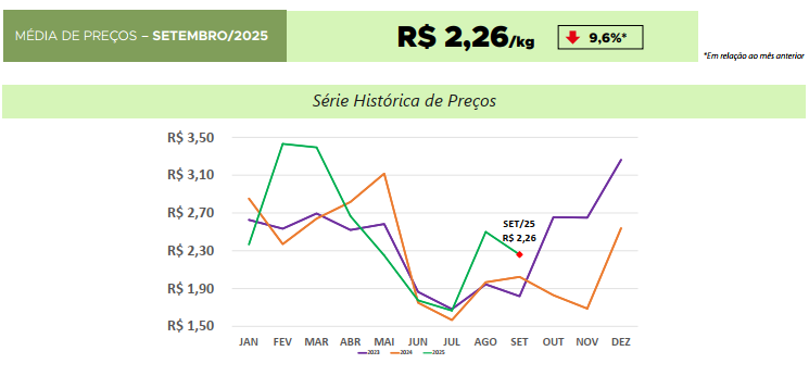 Em Goiás, na segunda quinzena de setembro, o aumento da oferta de melancia* em Uruana pressionou os preços, que voltaram a cair após um breve período de alta registrada no início do mês. Segundo o Hortifrúti/Cepea, a retração está ligada à redução da demanda típica do período e às temperaturas mais amenas nas regiões Sul e Sudeste, que diminuem o consumo. Em outubro, a desaceleração na colheita na região de Uruana provocou reação nos preços, assim como nas demais praças produtoras. No atacado do estado de São Paulo, as vendas se enfraqueceram, em virtude do clima mais frio. Entretanto, é esperado recuo da demanda e consequentemente dos preços da fruta com o encerramento de mês.
