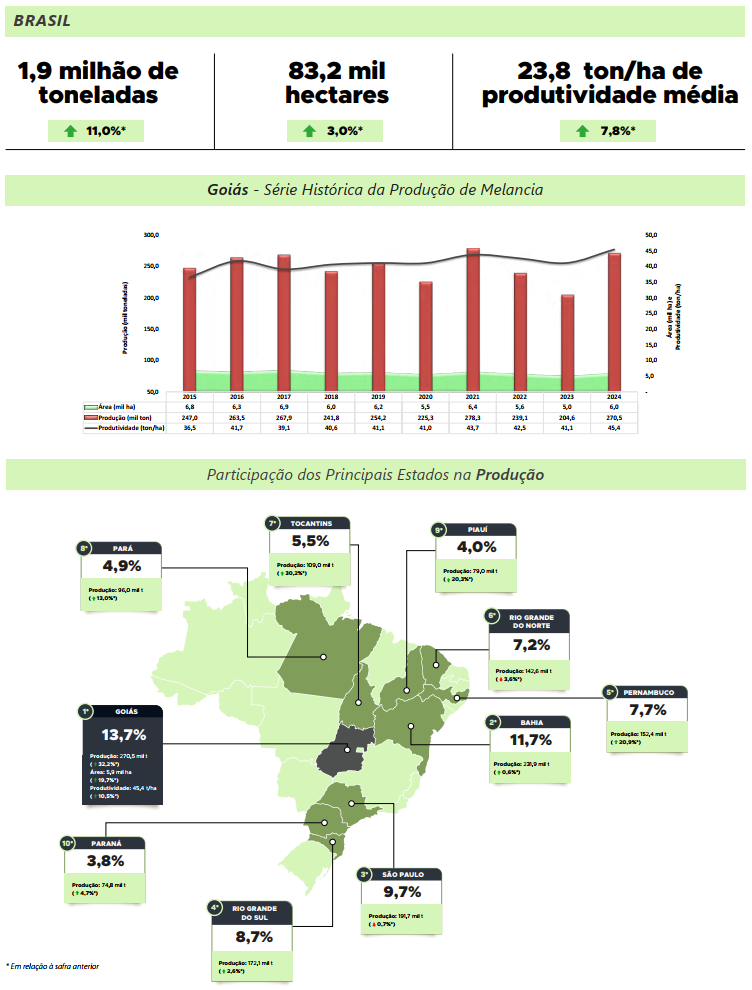 Em Goiás, a melancia é o quarto fruto mais cultivado no estado, com grande impacto socioeconômico, responsável pela geração de emprego, renda e fortalecimento da fruticultura regional. Em 2024, segundo o IBGE, Goiás superou o estado da Bahia e passou a ocupar a liderança na produção brasileira.