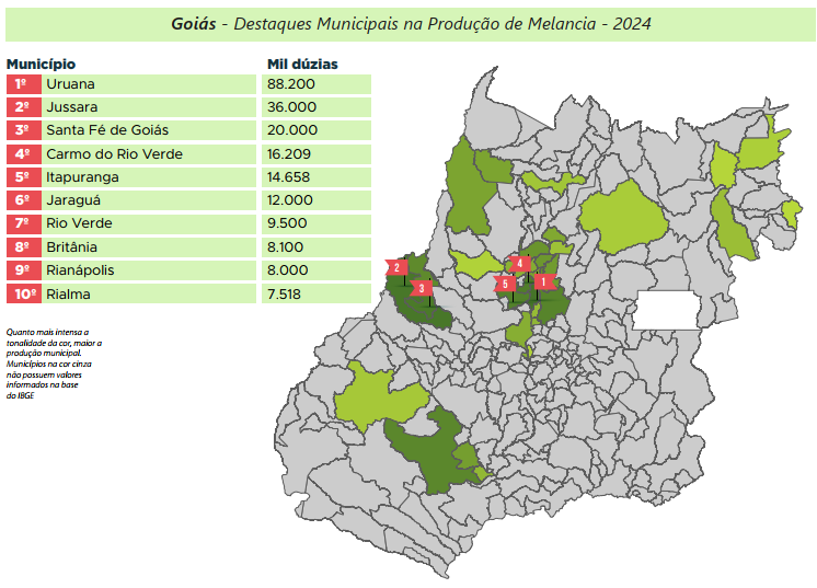 Em relação aos municípios goianos, Uruana destaca- -se por ser o maior produtor de melancia do país. A cidade é responsável ainda por 32,6% do volume produzido pelo estado. No mesmo ano, Jussara retomou o cultivo da fruta, alcançando a segunda posição no ranking estadual. Ademais, Santa Fé de Goiás obteve o maior avanço na atividade em relação a 2023, duplicando sua produção, de acordo com os dados do IBGE.