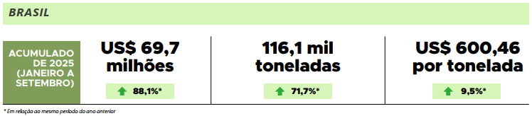 Quanto aos destinos do produto goiano, os embarques são historicamente direcionados aos países do Mercosul (Argentina, Paraguai e Uruguai). Já em 2023, os Emirados Árabes Unidos entraram no rol de compradores. Atualmente, ao considerar o acumulado de janeiro a setembro de 2025, o país asiático é o que remunera melhor a tonelada exportada pelo estado.