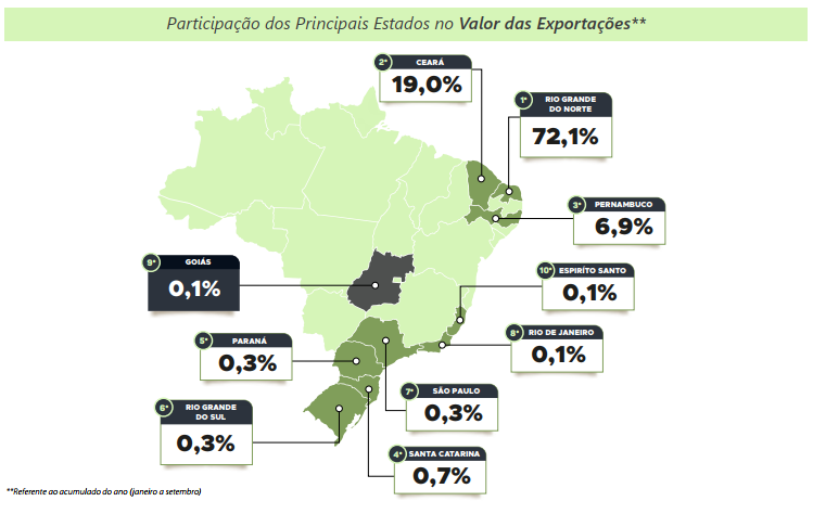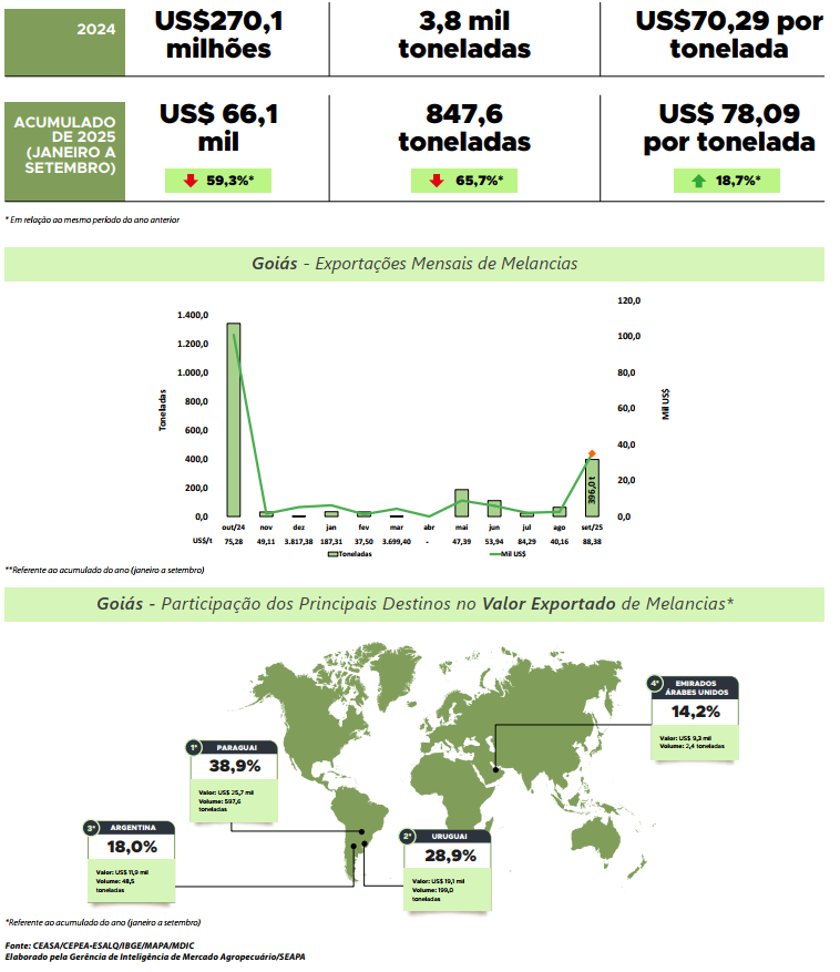 As exportações brasileiras de melancia concentram-se no período de janeiro a setembro, com decréscimo nos envios nos meses subsequentes. Em 2024, o Brasil alcançou recorde em volume exportado e segundo melhor resultado da série histórica em faturamento. Para Goiás, nesse período foi registrado o melhor desempenho dos últimos seis anos em valor exportado da fruta, totalizando US$270,1 mil.