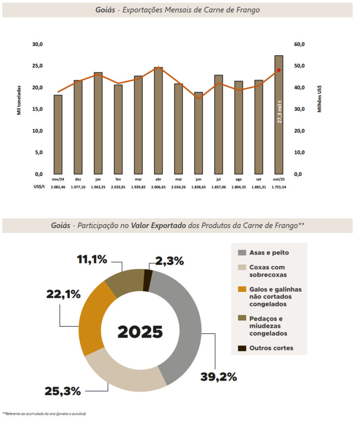 No panorama internacional, a diversificação de mercados é uma estratégia essencial para proteger fornecedores de commodities das dinâmicas do comércio exterior. Nesse cenário, apesar da China não ter retomado de forma significativa suas aquisições de carne de frango, ainda em decorrência do surto de Influenza Aviária registrada no Brasil, a Coreia do Sul, por sua vez, demonstra uma ascensão nas transações. No âmbito estadual, o país asiático alcançou marca histórica em valor e volume importado da proteína goiana no acumulado de 2025. Já no mês de outubro, a Coreia do Sul foi o principal destino da carne de frango, com aquisição de 3,2 mil toneladas no valor de US$7,4 milhões, registrando avanços em valor, volume e preço pago por tonelada em relação ao mesmo período do ano passado. Dessa forma, a expectativa para o setor é de demanda interna e exportações aquecidas, em virtude das festividades de fim de ano e, consequentemente, retomada do ritmo habitual das transações.