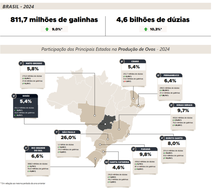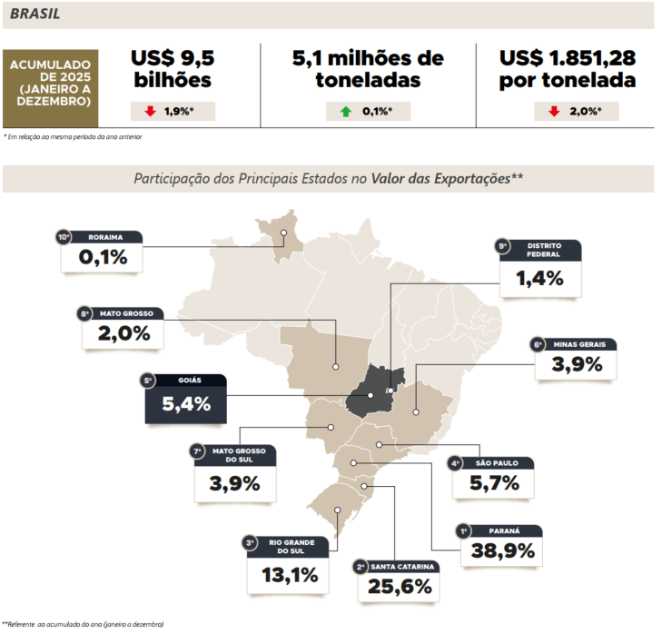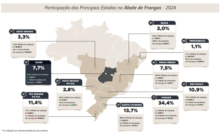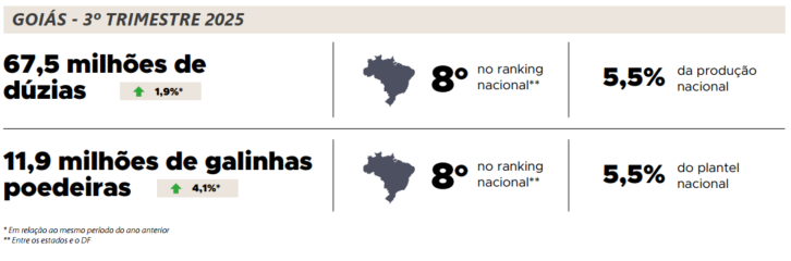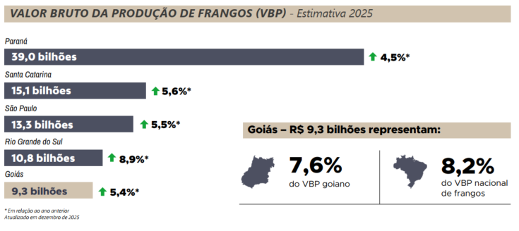 Em 2025, de acordo com o MAPA, o Valor Bruto da Produção(VBP) de frangos alcançou o maior valor da série histórica tantopara Goiás quanto para Brasil, reforçando o protagonismo da avicultura de corte na pecuária brasileira. No âmbito nacional, o VBP atingiu R$ 112,4 bilhões, avanço de 5,5% frente ao ano anterior.Na mesma base de comparação, para Goiás, o valor foi de R$ 9,3bilhões, crescimento de 5,4%, evidenciando a competitividade ea consolidação do setor no estado. Esse desempenho posicionaGoiás como o 5º maior VBP do país na avicultura de corte, atrássomente dos estados da região sul e de São Paulo. Ademais, a atividade representa aproximadamente 23,1% do VBP da pecuáriagoiana, o que destaca seu papel estratégico na geração de renda,na dinâmica produtiva e no fortalecimento do agronegócio.