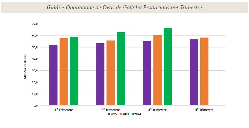 Em relação à produção de ovos, de janeiro a setembro de 2024, houve aumento na produção de 8,9% para o Brasil e de 8,1% para Goiás, de acordo com o IBGE. Concomitantemente, houve destaque para Goiás que iniciou as exportações de ovos em dezembro de 2023 para a África do Sul. Já em 2024, alcançou novos mercados: Venezuela, México, Senegal, Arábia Saudita e Costa do Marfim, além da África do Sul.