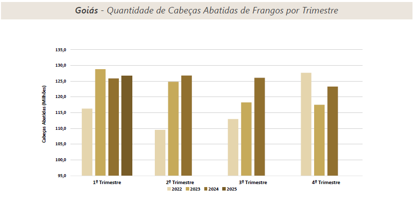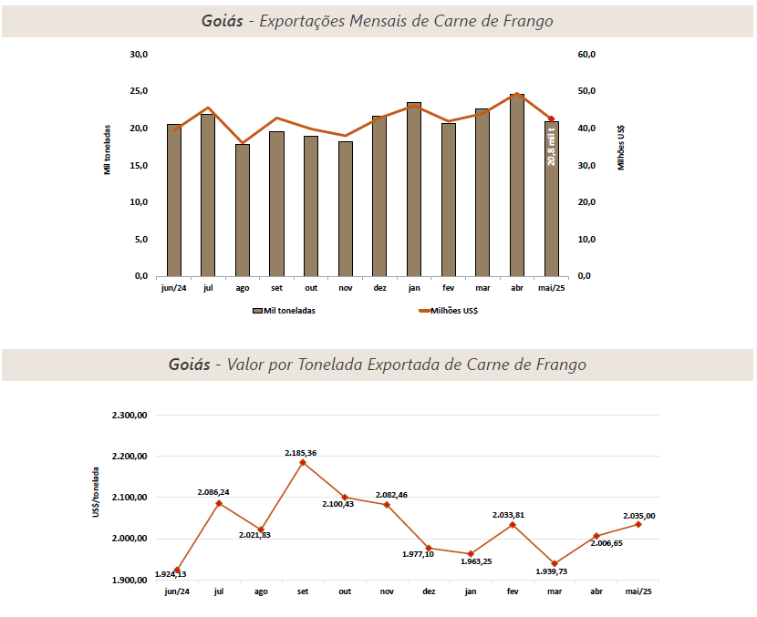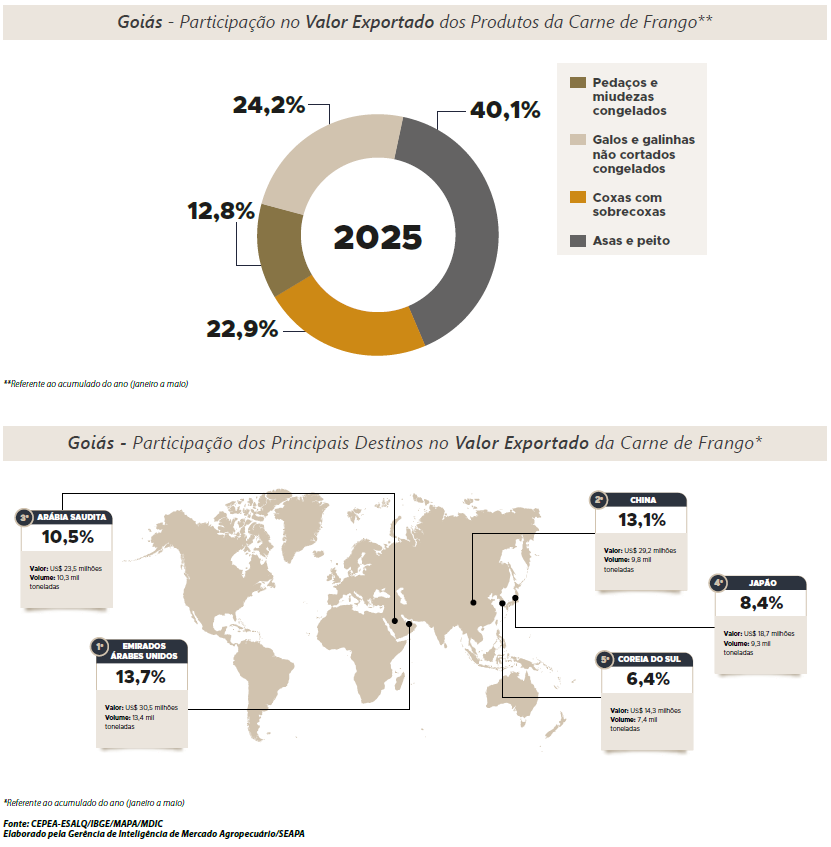 No dia 22/05 deu-se início ao vazio sanitário de 28 dias no matrizeiro foco de gripe aviária, no município de Montenegro (RS). Decorrido esse período e sem novas ocorrências registradas na avicultura comercial, o Brasil concluiu as exigências da Organização Mundial da Saúde Animal (OMSA), recuperando assim o status internacional de país livre da doença. Dessa forma, foi retirada a restrição para exportação da proteína brasileira por 16 países. Dentre eles, destacam-se como destinos mais representativos da carne de frango brasileira e goiana o Iraque e a Líbia. Ademais, com o fim do estado de emergência sanitária no município de Montenegro, declarado pelo MAPA, a expectativa é de normalização na comercialização internacional da carne de frango no decorrer dos próximos meses.