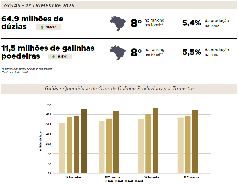 Já para o estado de Goiás, as exportações de ovos estão em crescimento. Nesse período houve aumento de 6,5%* no volume exportado, com destaque para o mês de maio, responsável pela maior representatividade nas vendas externas. Além disso, nesse mês, os Estados Unidos passaram a integrar o portfólio de destinos do produto goiano, com uma participação de 80,1% no volume total comercializado, indicando assim um mercado em ascensão para Goiás.