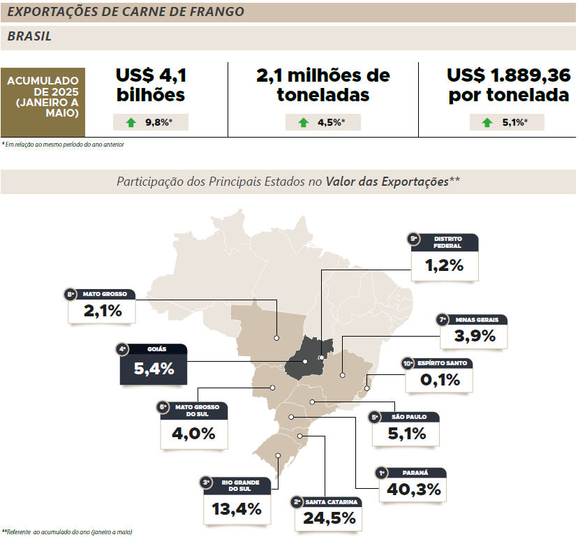 No panorama mundial, de janeiro a maio de 2025, o Brasil alcançou recorde em volume exportado de ovos e número de destinos, além do segundo melhor desempenho da série histórica em valor exportado, totalizando 26,1 mil toneladas embarcadas, no valor de US$ 86,1 mil para 93 destinos. Esse desempenho pode ser atribuído ao maior volume adquirido pelos Estados Unidos (+361,4%)*, ocupando assim o segundo lugar no ranking dos destinos das exportações brasileiras de ovos.