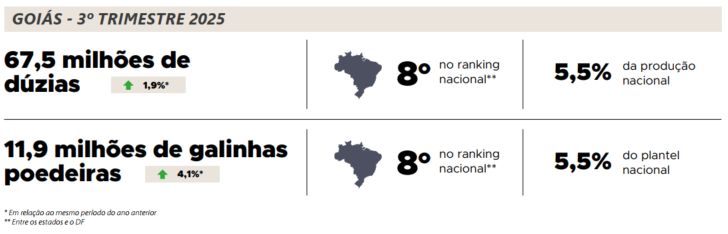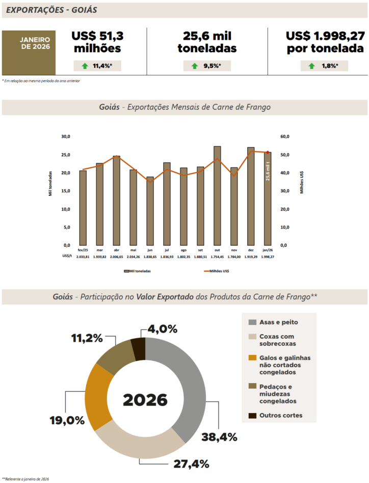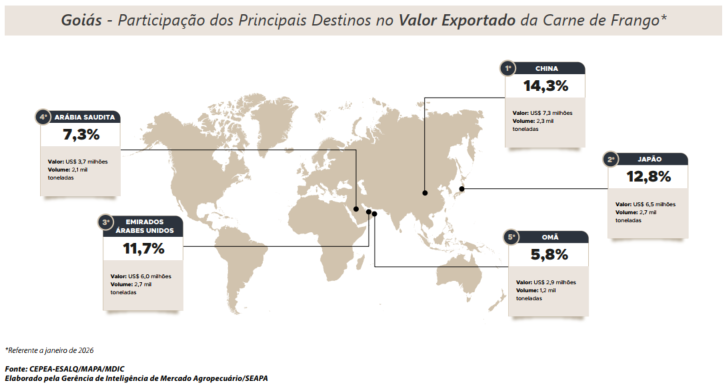Goiás tem registrado avanços expressivos nas exportações de carne de frango, com recorde observado no ano de 2025. Esse dinamismo manteve-se no início de 2026: em janeiro, o estado alcançou o maior número de destinos, volume e valor exportado da série histórica para o mês, com embarques para 70 países, na comparação entre meses de janeiro, o que reforça a consolidação e a expansão do mercado externo. Esse desempenho também reflete o perfil da pauta exportadora goiana, caracterizada pela elevada participação de produtos com maior grau de processamento, que apresentam valor por tonelada superior ao da carne de frango in natura.