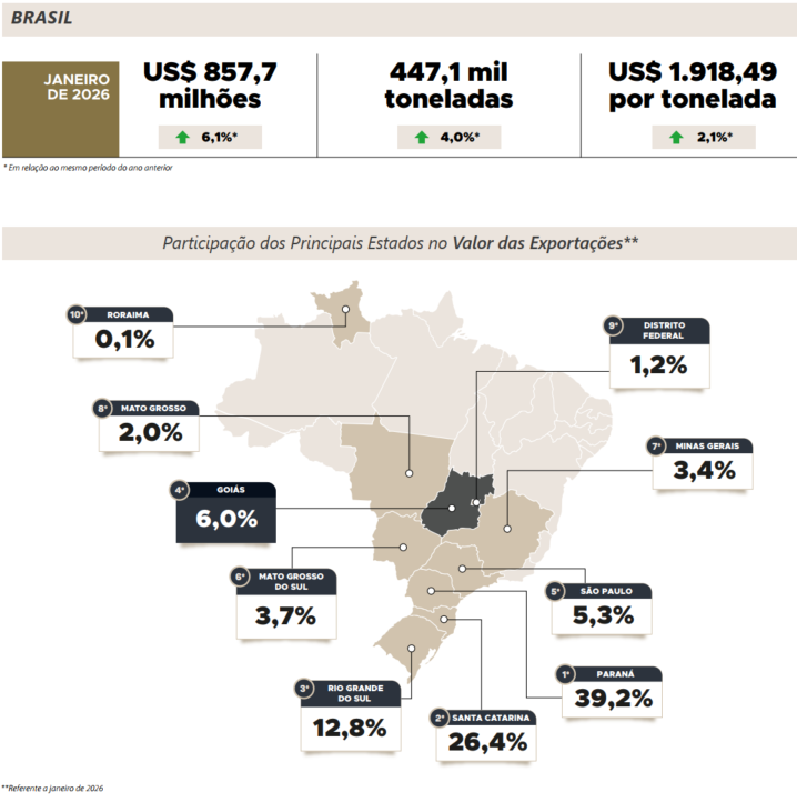 Nesse âmbito, em janeiro, o preço médio da carne de frango exportada pelo estado foi de US$ 1.998,27/t, cortes desossados alcançaram patamares significativamente mais elevados, como o peito de frango desossado, negociado a US$ 2.633,44/t. Além do maior valor por tonelada, o peito desossado possui relevância expressiva na composição das exportações, respondendo por 27,4% do valor total exportado, o que aponta uma estratégia orientada à agregação de valor, o que oferece maior praticidade ao consumidor final, aspecto cada vez mais valorizado pelos mercados importadores.