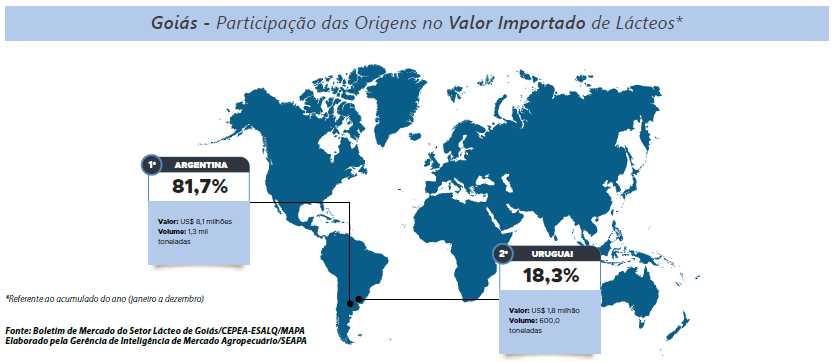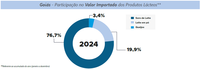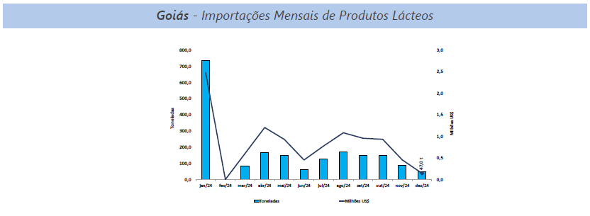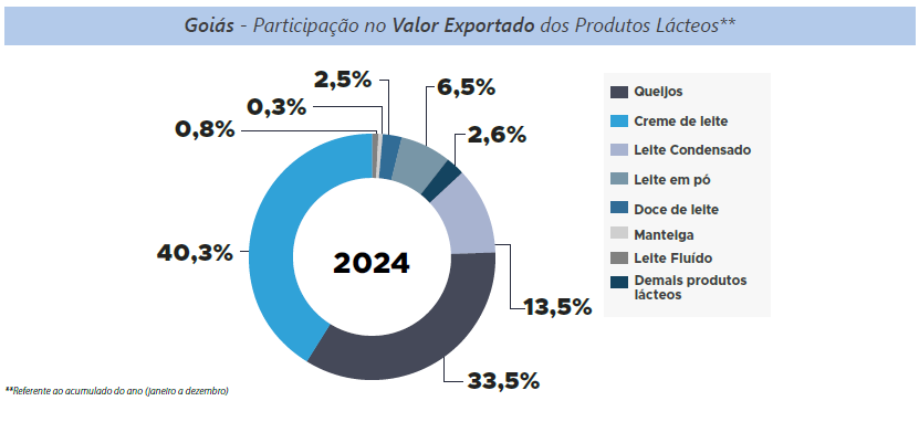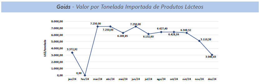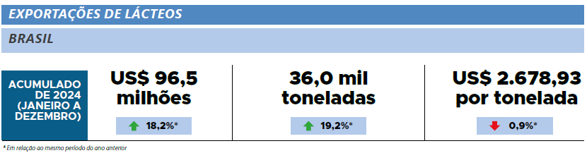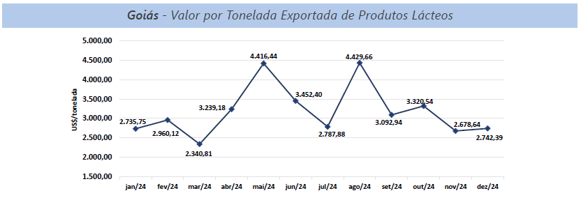 As exportações brasileiras de lácteos, em 2024, tiveram como destino 105 países, com elevação nas aquisições feitas pelos principais parceiros comerciais: Cuba, Estados Unidos, Argentina e Filipinas. Já em dezembro, o volume enviado para o exterior foi 9,6% maior que o mesmo período em 2023. Em relação a Goiás, o crescimento foi mais expressivo, de 140,2%, posicionando dezembro como o quarto mês com melhor desempenho do ano. No ano de 2024, houve destaque para o Chile, que remunerou melhor que a média dos destinos dos produtos lácteos goiano, na qual o valor é 34,9% superior à média paga pelos países compradores. Para Goiás, o preço pago é de US$3.924,16 por tonelada, 38,8% a mais que a média paga para o Brasil pelo país chileno.