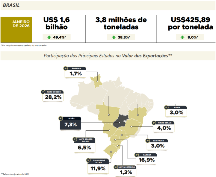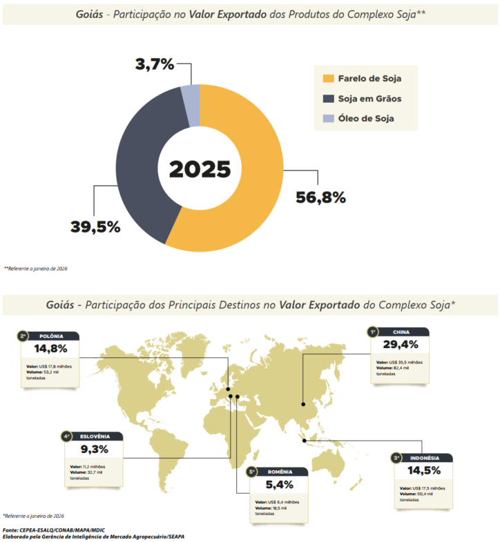 Para a safra 2025/26, segundo dados do USDA, é esperado que o Brasil seja responsável por 42,1% da produção mundial e por atender 60,9% da demanda global, valores que podem crescer com o aumento nas aquisições dos países parceiros ou redirecionamento de novos compradores para a soja brasileira. Nesse contexto de relevância brasileira no mercado mundial, o estado de Goiás assume papel relevante no desempenho nacional enquanto 4º maior produtor e exportador de soja.