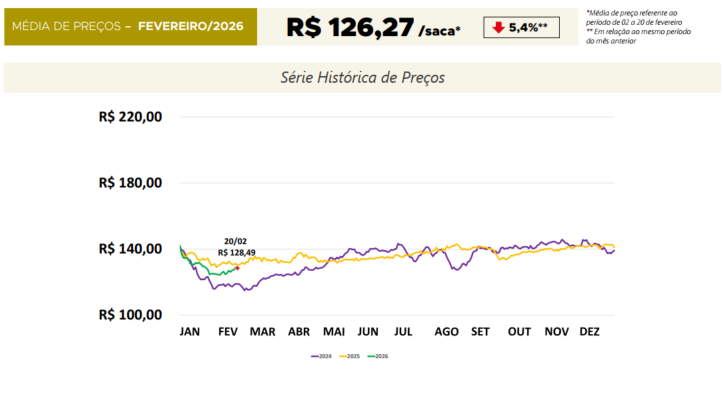 No mercado doméstico, a média mensal das cotações em fevereiro de 2026 registrou recuo pelo segundo mês consecutivo, atingindo R$ 126,33/saca, patamares próximos ao registrado em abril de 2024. Segundo o Cepea, esse recuo nos preços pode ser atribuído, à expectativa de safra recorde e à desvalorização do dólar frente ao real, o que reduz a paridade de exportação e por consequência, a competitividade da soja brasileira no mercado externo. Todavia, no mercado futuro da CBOT*, os contratos de derivados (óleo de soja e farelo) registraram alta, o que reflete, dentre outros fatores, as tensões no Oriente Médio, que aumentam a volatilidade do mercado de energia e elevam a relevância do óleo de soja como insumo para fabricação de biocombustíveis.
