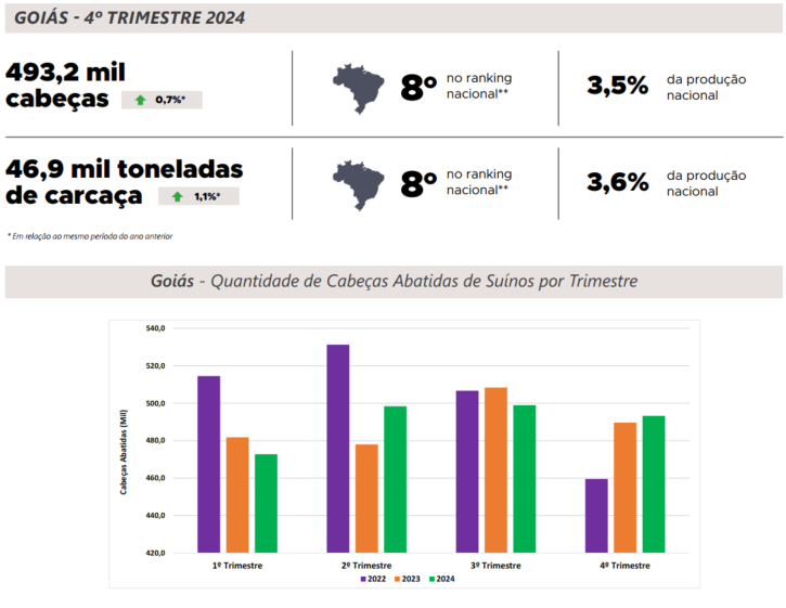 A produção de suínos no estado de Goiás segue em crescimento em 2025, com destaque para o mês de fevereiro com elevação significativa das exportações, alta das cotações e projeções promissoras para o ano. Em relação ao abate de suínos no quarto trimestre de 2024, os resultados são positivos, com aumento no número de animais abatidos de 1,2% para o Brasil e de 0,3% para Goiás, em relação ao mesmo período do ano de 2023. O rebanho suíno brasileiro, de acordo com a Conab, deve atingir 44,1 milhões de cabeças, um acréscimo de 1,2% em relação a 2024. Além disso, com uma produção crescente de carne suína, o Brasil poderá alcançar 5,5 milhões de toneladas de carne produzida no ano, consolidando sua posição no mercado nacional e internacional.