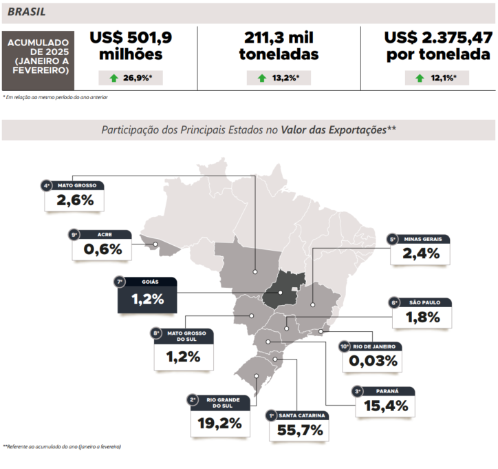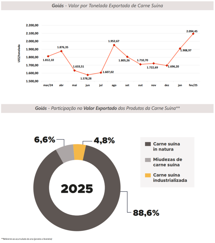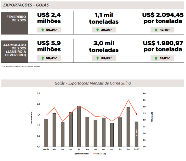 No panorama internacional, para Goiás, a Singapura liderou o ranking dos destinos da carne suína, na qual foi responsável por 51,3% do volume total exportado no primeiro bimestre do ano. Ademais, o Quênia ganhou notoriedade ao adquirir 124,3 toneladas nos meses de janeiro e fevereiro, valor nunca alcançado antes para esse período, visto que em 2024 suas aquisições se concentraram nos meses de julho e agosto.