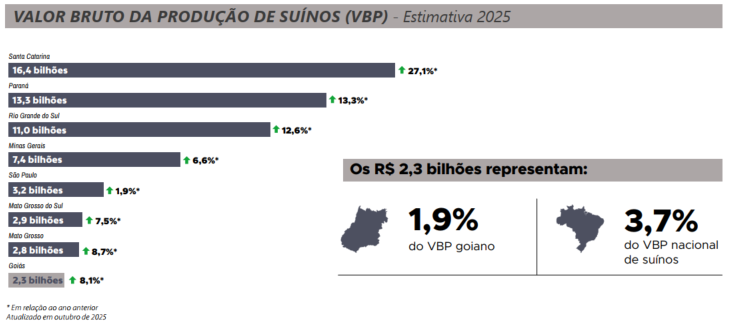 A suinocultura brasileira voltou a crescer em Valor Bruto da Produção (VBP) entre 2023 e 2025, após duas quedas consecutivas. Goiás acompanhou esse movimento no mesmo período, com destaque para 2024, quando registrou um avanço de 25,1% sobre 2023. Esse resultado reflete um mercado aquecido, marcado pela valorização da carne suína nos últimos três anos. Nesse cenário, a produção também foi estimulada e Goiás alcançou um recorde de carcaças abatidas em 2024, justificando, dentre outros fatores, o aumento do VBP.