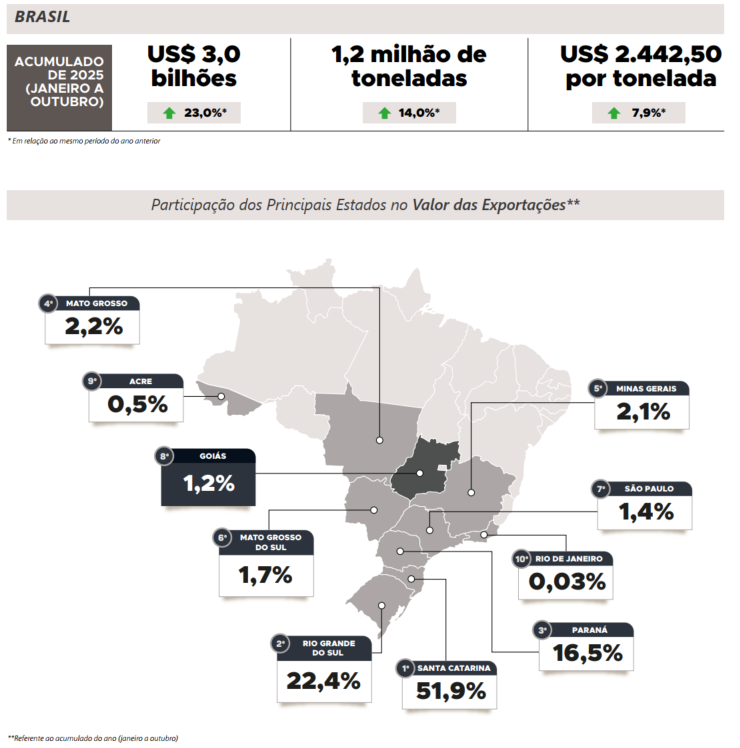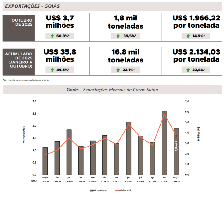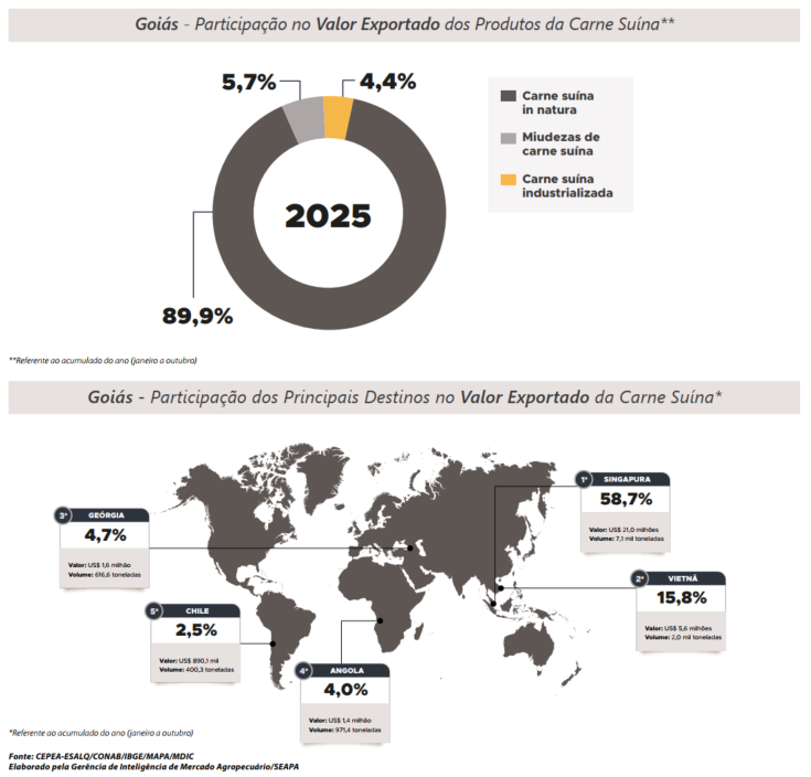 O setor em questão segue impulsionado especialmente pela comercialização no mercado exterior. Em outubro, foi registrado avanço nas exportações goianas de carne suína de 60,3% em valor e de 39,5% em volume, frente ao mesmo período do ano anterior. Esse cenário pode ser atribuído ao aumento nas aquisições da proteína suína do principal parceiro comercial do estado – Singapura – responsável por 51,1% do valor exportado em outubro, na qual os envios foram concentrados em carne suína in natura. O desempenho positivo observado nesse período reforça a expectativa positiva da Conab para as exportações brasileiras, projetadas para alcançar 1,4 milhão de toneladas em 2025.