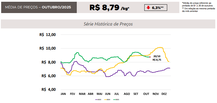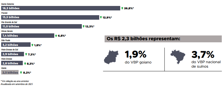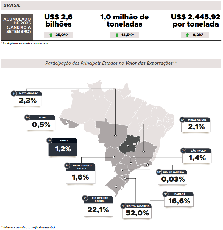 Quanto às exportações brasileiras de carne suína, em setembro de 2025 foi registrado marco histórico para o mês em número de destinos, valor e volume exportado. Foram 148,0 mil toneladas embarcadas (+25,9%)* com um faturamento deUS$365,2 milhões (+30,0%)* para 88 países, demonstrando assim, um mercado aquecido, combinado com o fortalecimento dos já existentes e alcance de novos mercados, através da comprovação de qualidade de produção dessa proteína, inclusive no aspecto sanitário. Paralelamente, o estado de Goiás, alcançou recorde em número de compradores e o melhor desempenho dos últimos sete anos para esse período.