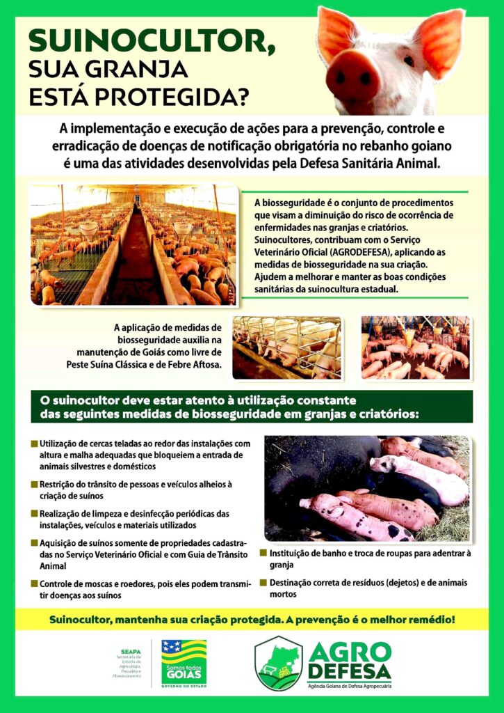A AGRODEFESA é o órgão responsável pelas ações de defesa sanitária referentes a suinocultura em Goiás, todas as atividades são regidas pelo Programa Nacional de Sanidade Suídea do Ministério da Agricultura, Pecuária e Abastecimento (MAPA).