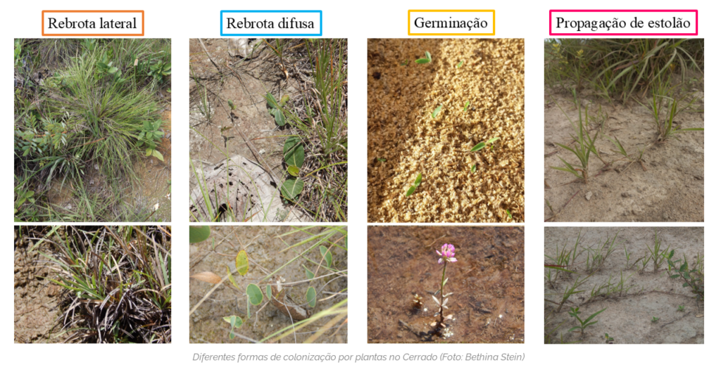 Para investigar essas questões causamos uma perturbação em um campo Cerrado conservado e em uma pastagem degradada dominada por espécies invasoras, removendo as plantas, solos e raízes e após um ano e meio retornamos às parcelas para monitorar quais espécies haviam colonizado e se a forma de ocupação e desenvolvimento foi através da germinação de sementes ou rebrota das estruturas subterrâneas. O que descobrimos?