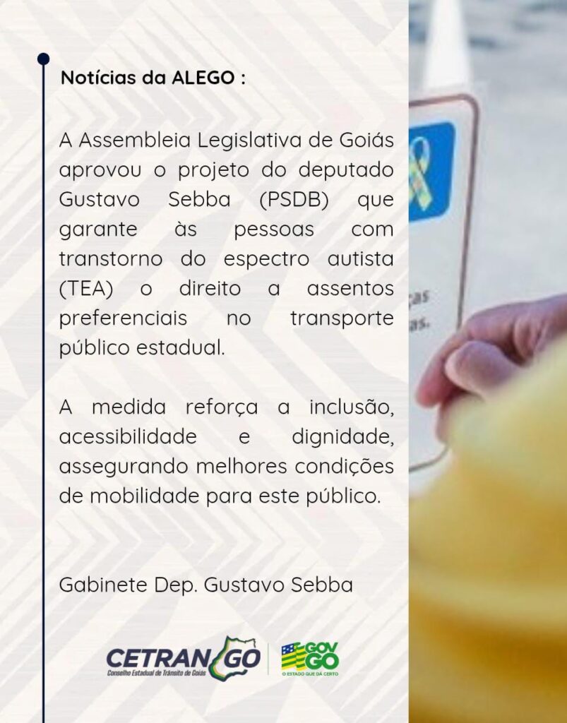 A Assembleia Legislativa de Goiás aprovou, em segundo turno, o processo nº 4759/23, de autoria do deputado estadual Gustavo Sebba (PSDB), que garante às pessoas com transtorno do espectro autista (TEA) o direito de utilizar assentos preferenciais na rede de transporte público estadual.