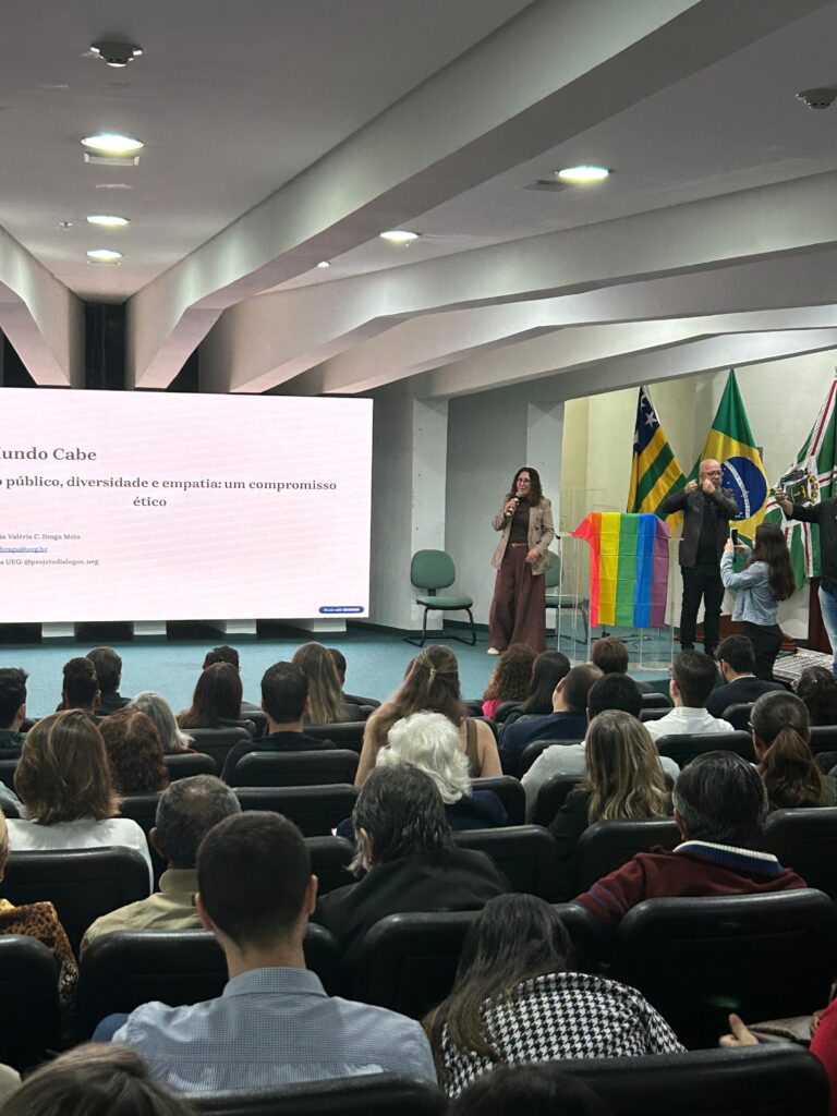 O evento seguiu com palestra da professora, doutora em Antropologia Social pela UFG e membro do Comitê Goiano de Enfrentamento à LGBTfobia e do Comitê Permanente para Questões da Mulher e Diversidade da UEG, Flávia Melo. Ela destacou o papel do Estado e do serviço público na promoção do respeito à diversidade e garantia de direitos.