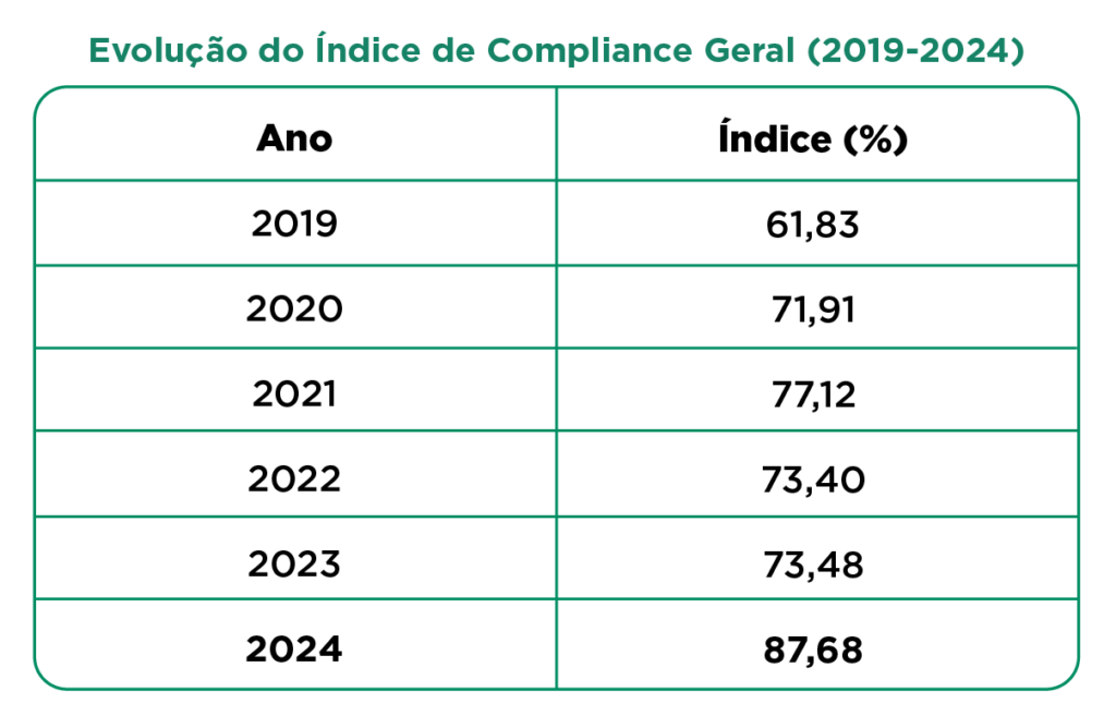 O Índice de Compliance Geral mede o grau de aderência dos órgãos e entidades aos critérios do programa, que incluem ética, transparência, responsabilização e gestão de riscos.