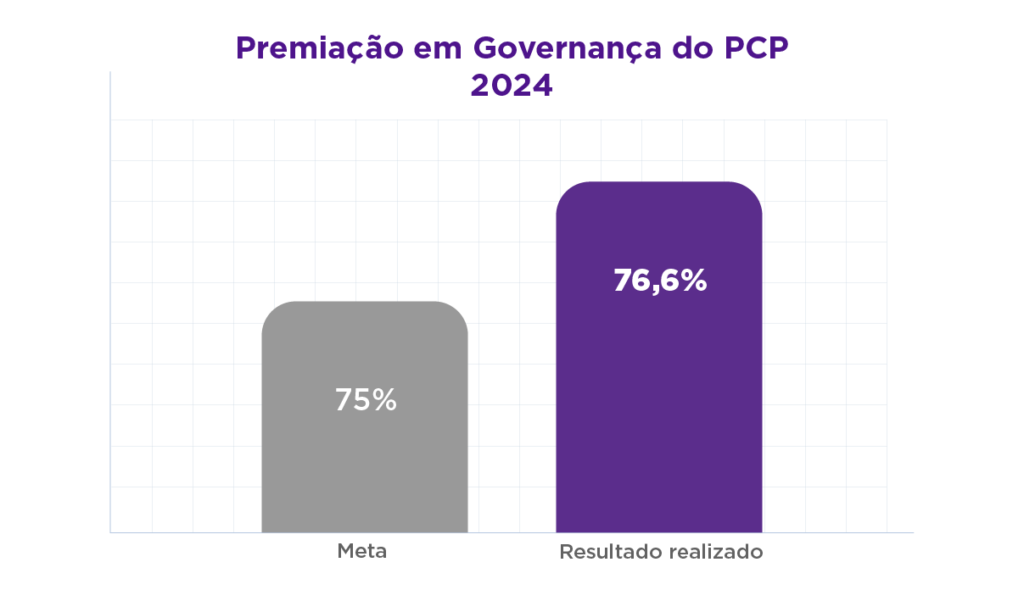 O índice de premiação em Governança do PCP, que contempla boas práticas de governança e gestão de riscos, atingiu 76,60%, superando a meta de 75%.