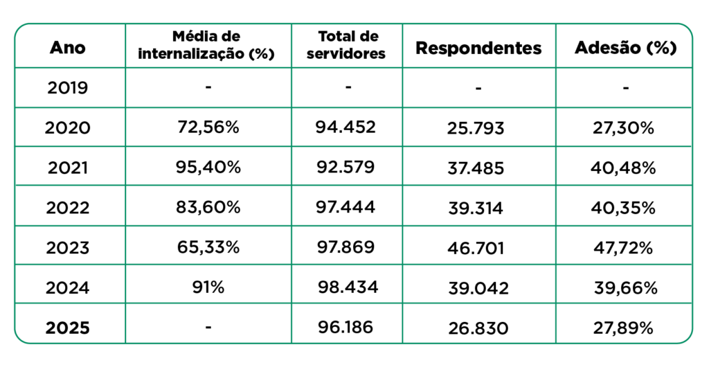 Até 2024, aplicava-se um teste de conhecimentos para aferir a internalização dos temas ética e responsabilidade. Em 2025, o instrumento foi reformulado para um questionário de percepção, baseado na opinião dos servidores, o que impossibilita a apuração da média de internalização neste exercício.