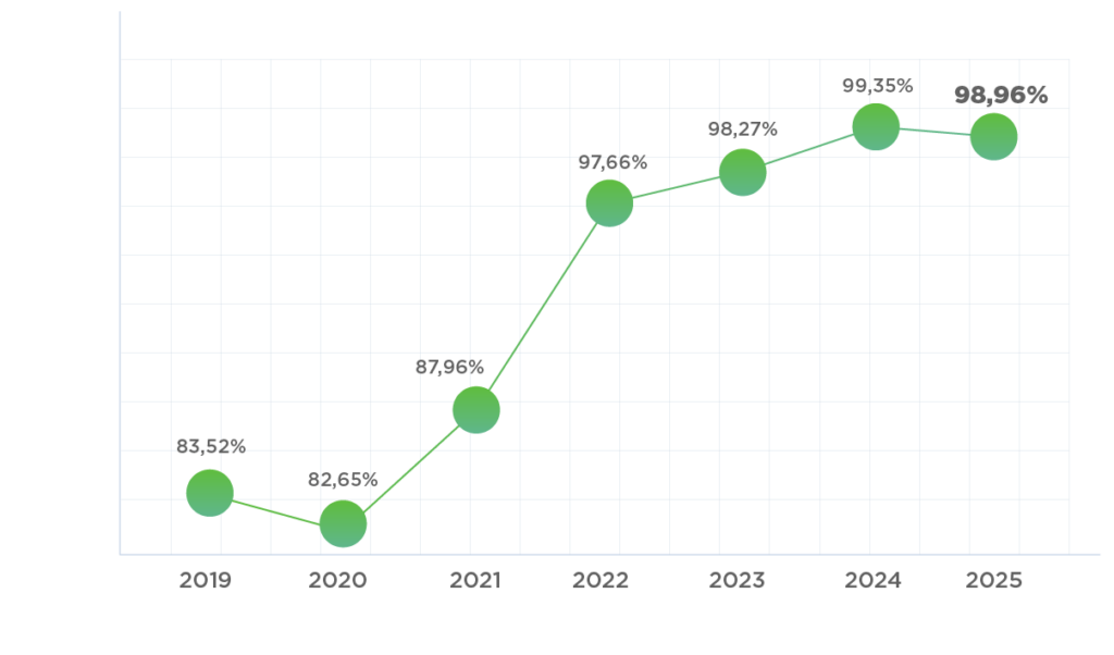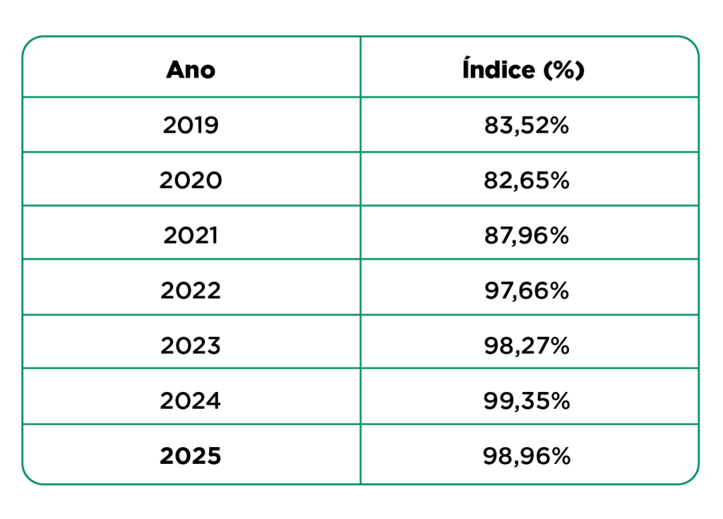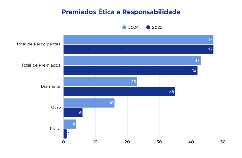 Em 2024, 88,38% dos participantes alcançaram algum nível de premiação (Prata, Ouro ou Diamante). Em 2025, o índice passou para 89,40%, representando crescimento de 1,02 ponto percentual e evidenciando avanço consistente no desempenho dos participantes.