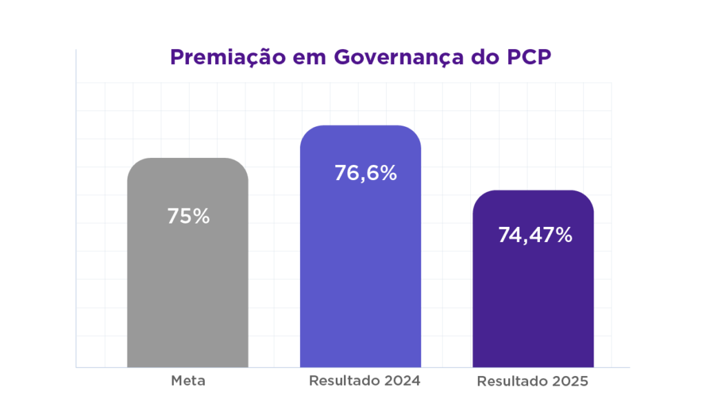 Em que pese a nota geral do Prêmio Governança ter subido de 80,19 (2024) para 83,49 (2025), considerando-se o somatório das notas obtidas em todos os quesitos por todos os órgãos/entidades, a atualização na tabela dos níveis de premiação resultou em uma leve redução do índice em 2025. Com isso, o resultado de 74,47% ficou ligeiramente abaixo do esperado.