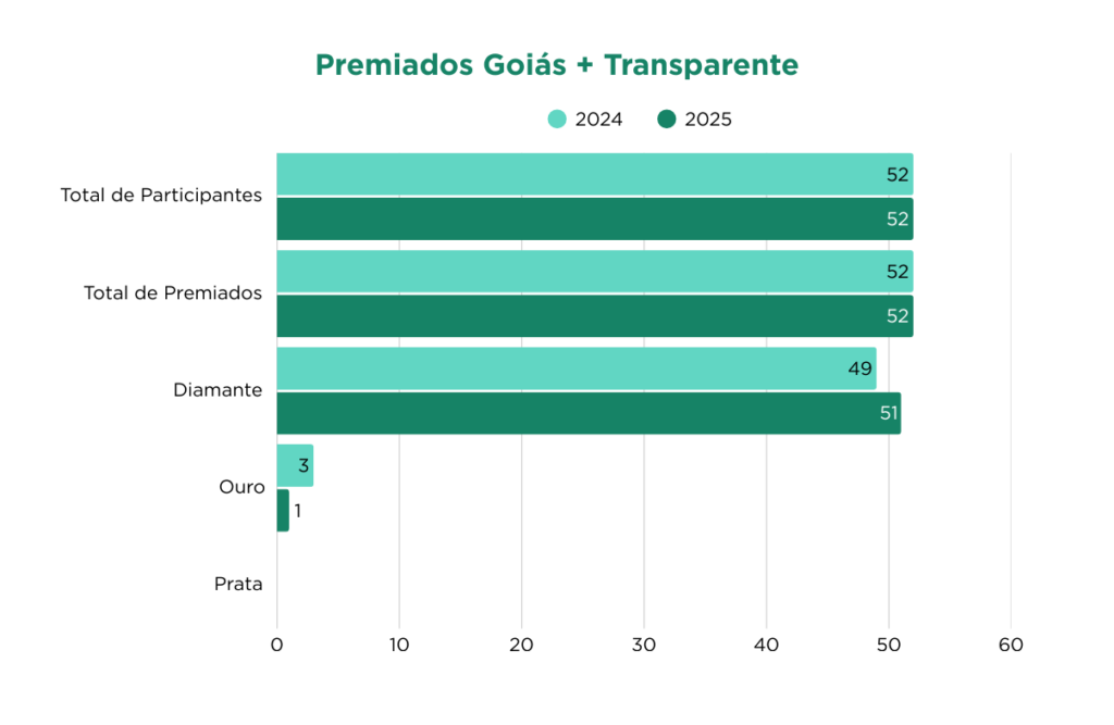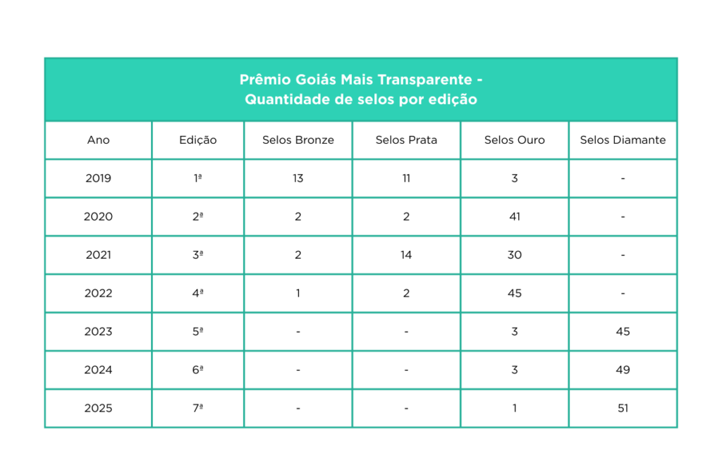 - Ao longo das 7 edições do Prêmio Goiás Mais Transparente ocorreu um expressivo aumento do nível de transparência dos órgãos e entidades avaliados, com aumento correspondente de selos diamante:
