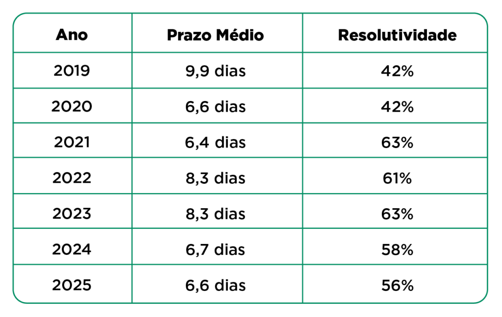 O Índice de Resolutividade, apurado por meio de pesquisa de satisfação aplicada ao manifestante após a finalização de sua demanda, indica a percepção do cidadão sobre o efetivo atendimento de sua solicitação. A evolução do indicador — de 42% em 2019 para patamares acima de 56% nos últimos exercícios — reflete o avanço qualitativo do canal, ainda que os resultados mais recentes sinalizem oportunidade de melhoria contínua.