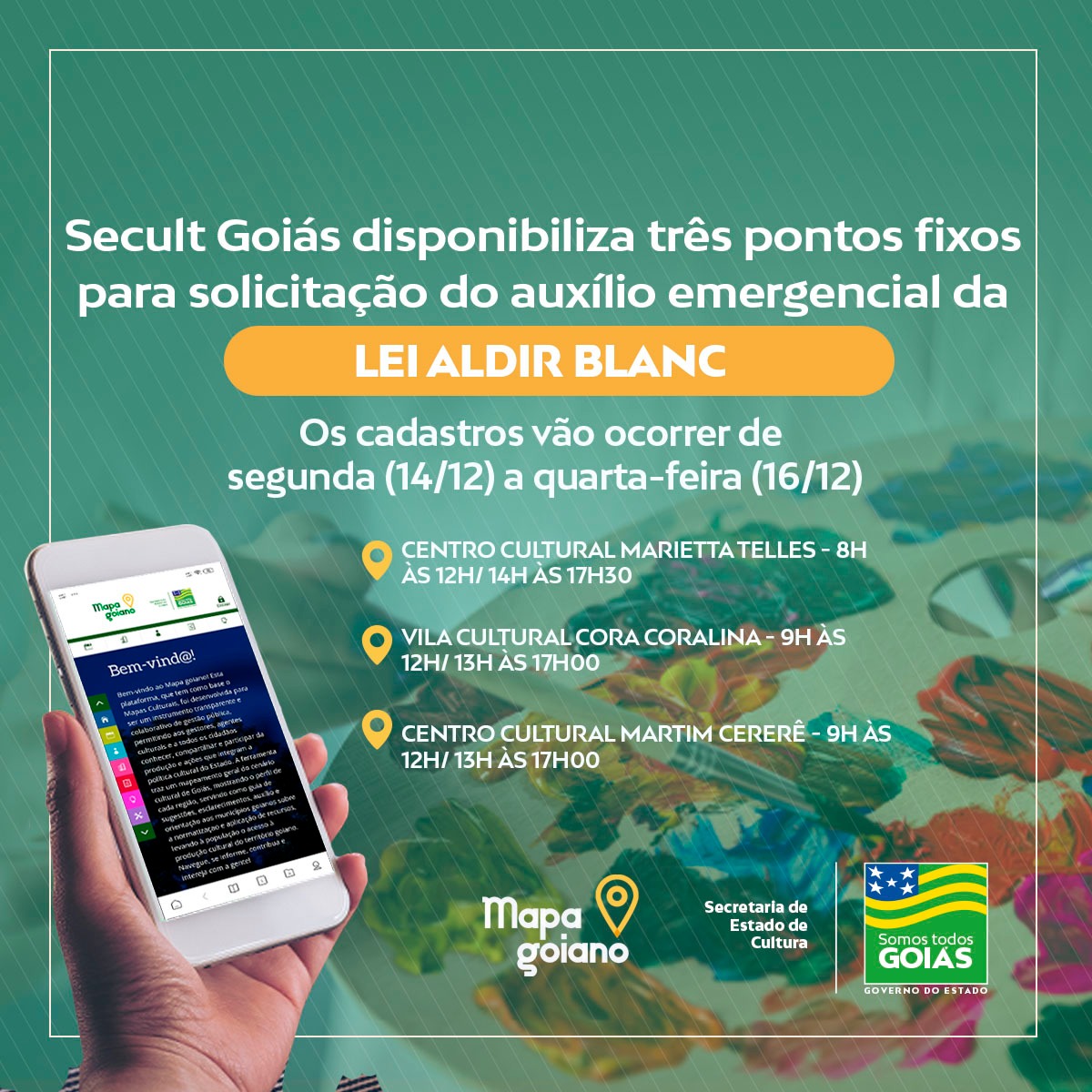 O Governo de Goiás, por meio da Secretaria de Estado de Cultura (Secult Goiás), montou três pontos físicos para que trabalhadores da cultura no estado possam solicitar o auxílio emergencial garantido pela Lei Aldir Blanc. Gestores da pasta estarão atendendo e auxiliando o cadastro dos interessados entre a próxima segunda (14) e quarta-feira (16).