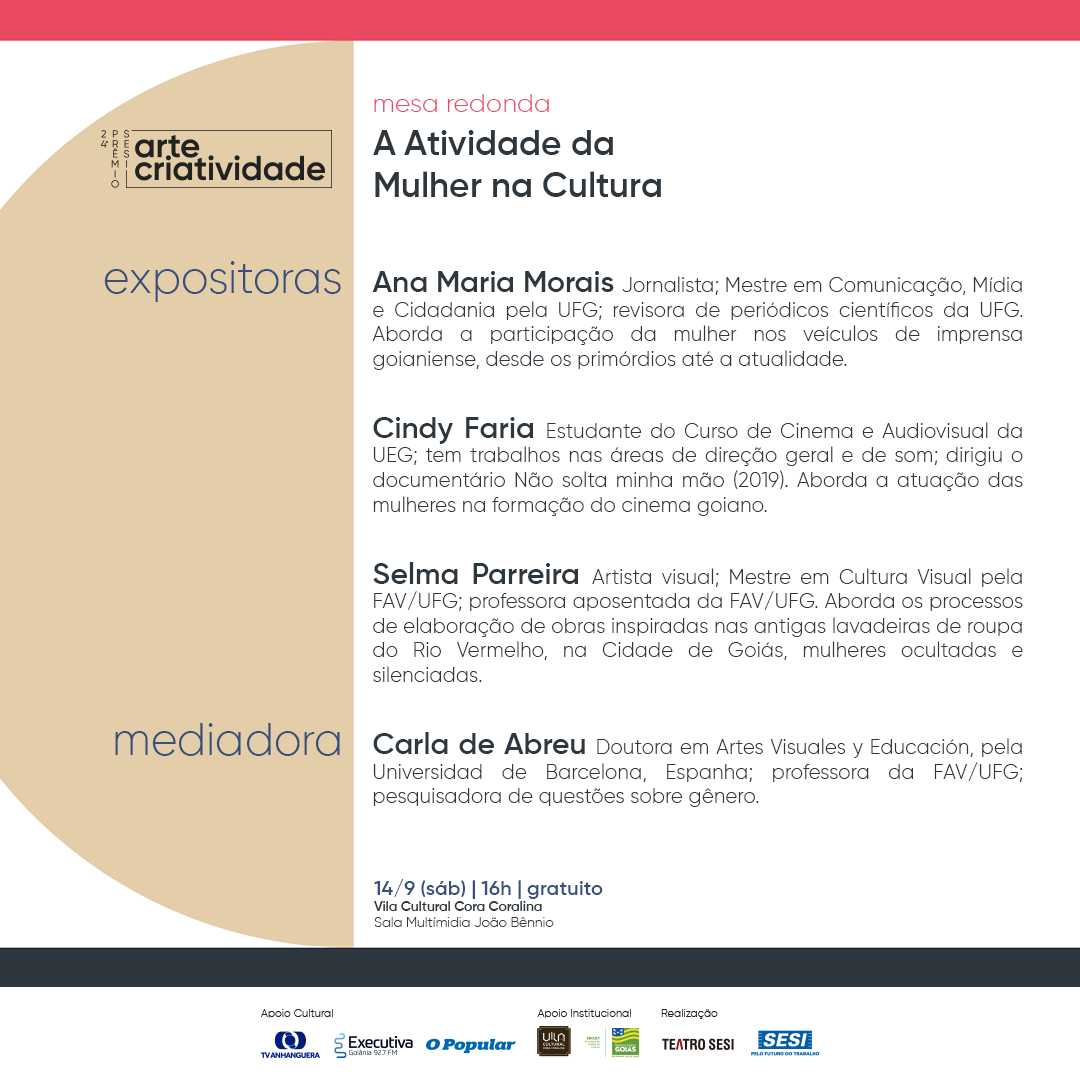 De acordo com a organização do evento, essa é a primeira ação educativa na história do Prêmio Sesi Arte e Criatividade e sua proposta é estabelecer um processo de diálogo e trocas com pesquisadores e com público. A mesa-redonda irá reunir pesquisadoras, de diferentes disciplinas e gerações, que desenvolveram destacados trabalhos de pesquisa teórica e de criação artística. Juntas, irão refletir e debater sobre a integração das mulheres nos sistemas de produção cultural em Goiás, especificamente em áreas de construção da imagem pública e da visibilidade social, como artes visuais, audiovisual e veículos de imprensa.