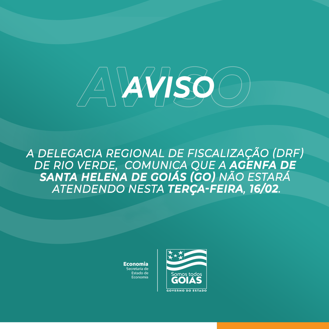 A Delegacia Regional de Fiscalização (DRF) de Rio Verde, jurisdicionada à Secretaria de Estado da Economia, comunica que a Agenfa de Santa Helena de Goiás (GO) não estará atendendo nesta terça-feira, 16/02. Nesta data será feriado de Carnaval conforme estabelece Lei Municipal nº 2959/18.