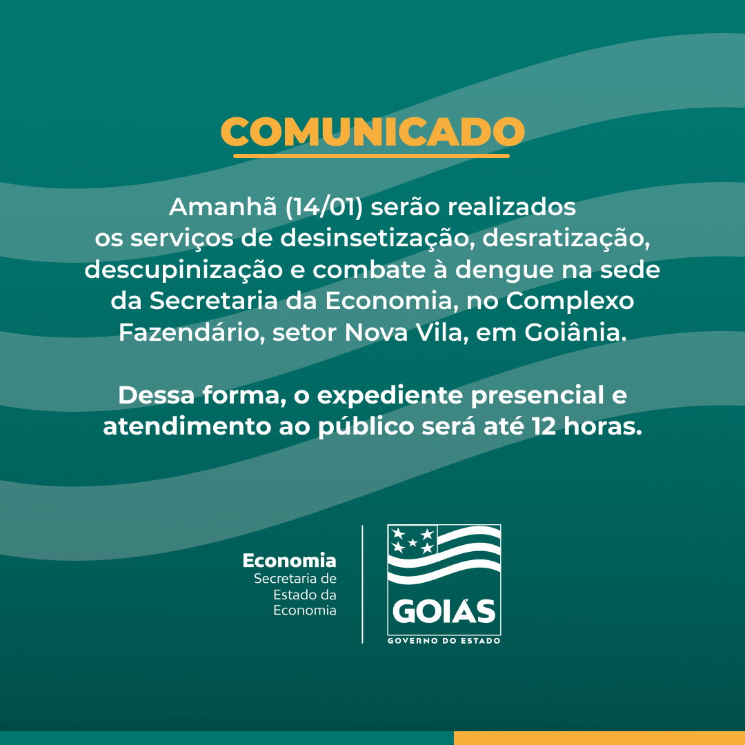 A Superintendência de Gestão Integrada (SGI), da Secretaria da Economia, por meio da Gerência de Apoio Administrativo e Logístico (Geals) e da Supervisão de Serviços Gerais (Supseg), comunica que na sexta-feira (14/1) serão realizados os serviços de desinsetização, desratização, descupinização e combate à dengue em todo o Complexo Fazendário, setor Nova Vila, em Goiânia, a partir das 12 horas.
